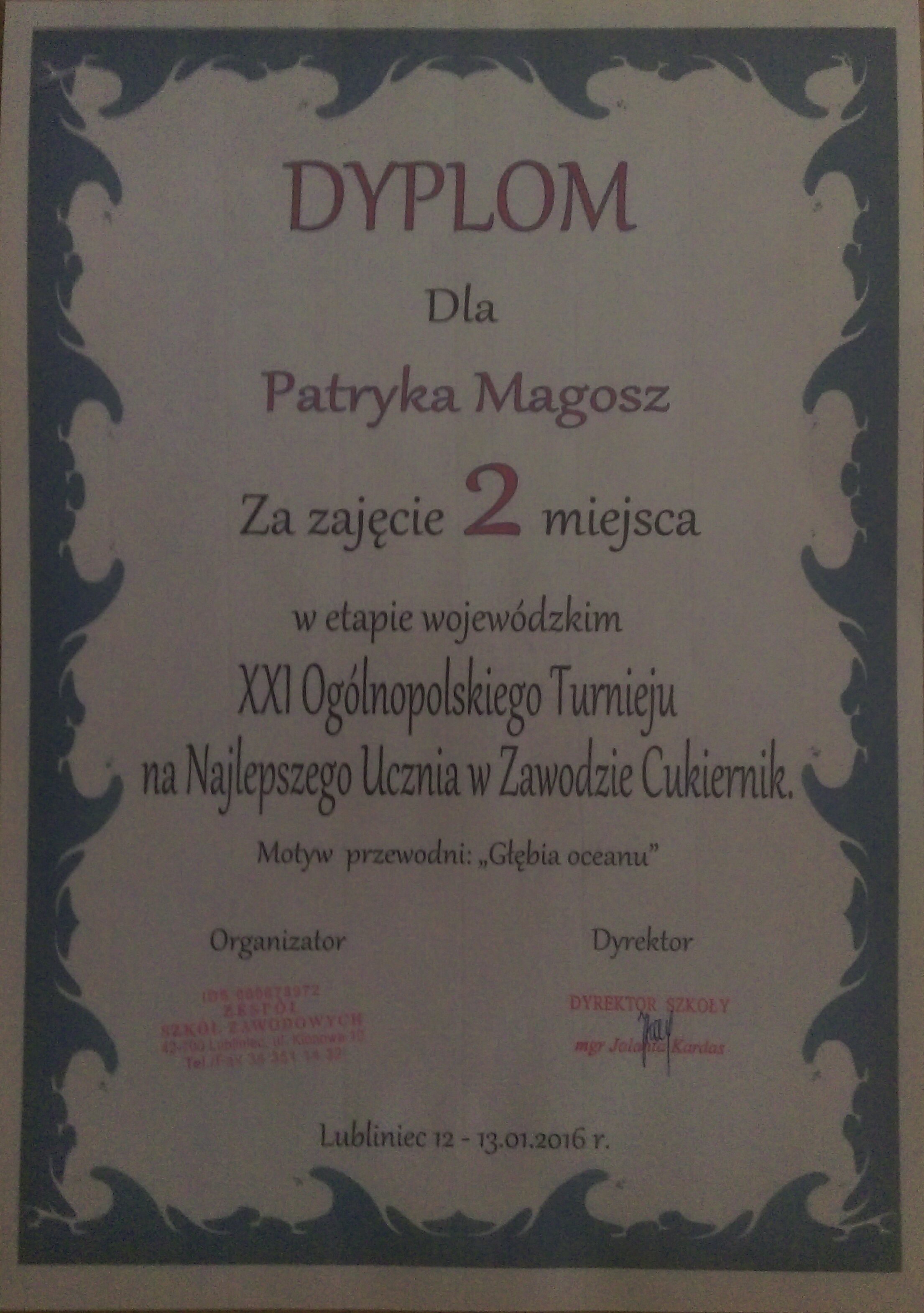 Z niełatwym tematem "Głębia oceanu" zmierzyli się młodzi ludzie, którzy wystartowali w XXI Ogólnopolskim Turnieju na Najlepszego Ucznia w Zawodzie Cukiernik i Piekarz. Wojewódzki etap konkursu rozegrany został w Lublińcu, a honorowy patronat nad turniejem objął m.in. śląski kurator oświaty Stanisław Faber . Turniej składał się z dwóch części: praktycznej i teoretycznej. Cukiernicy wykonywali ciasteczka bankietowe, składali i dekorowali torty oraz modelowali figurki marcepanowe. W części teoretycznej, która odbywała się 13 stycznia cukiernicy rozwiązywali test złożony z 30 zadań. Patryk Magosz wśród cukierników zajął II miejsce. Serdecznie gratulujemy!
