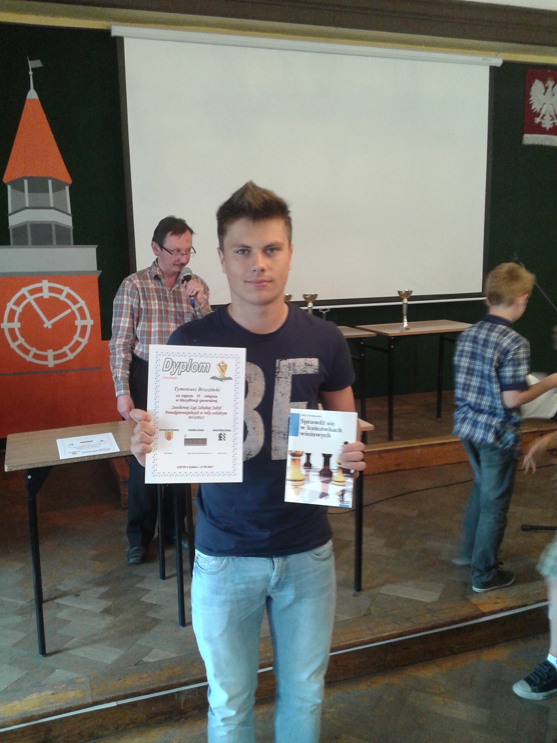 Pietrzak, Wiktor Krzemiński, Bartłomiej Gajda, Jakub Mikołajczyk, Kacper Cyzio. Nasza drużyna po rozegraniu 5 turniejów drużynowych osiągnęła Wielki Sukces zdobywając III miejsce (31,5 pkt) w kategorii drużynowej Szkół Ponadgimnazjalnych. W tej edycji Szachowej Ligi Szkolnej roku szkolnego 2014/2015 zostało rozegranych 5 turniejów drużynowych i 2 turnieje indywidualne. W klasyfikacji indywidualnej zakwalifikowało się 2 wychowanków Miejskiej Bursy Szkolnej : Wojciech Pietrzak i Tymoteusz Brzeziński. Po rozegraniu dwóch turniejów na 6 miejscu (17,5 pkt) uplasował się Tymoteusz Brzeziński, a na 7 miejscu (16,5 pkt) Wojciech Pietrzak. Gratulujemy !